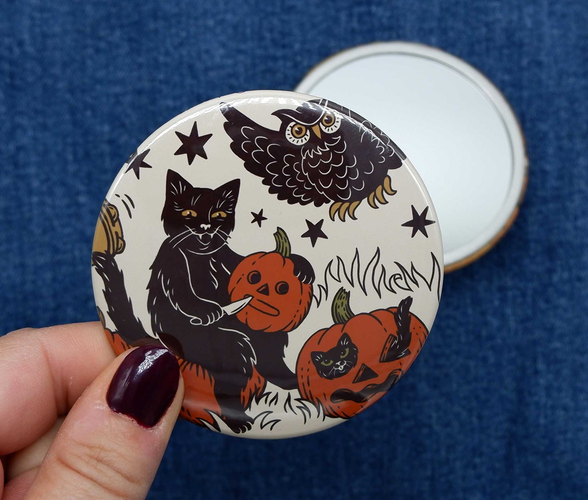 3" diameter. One side features the illustration in the first image, the other side has the mirror.
